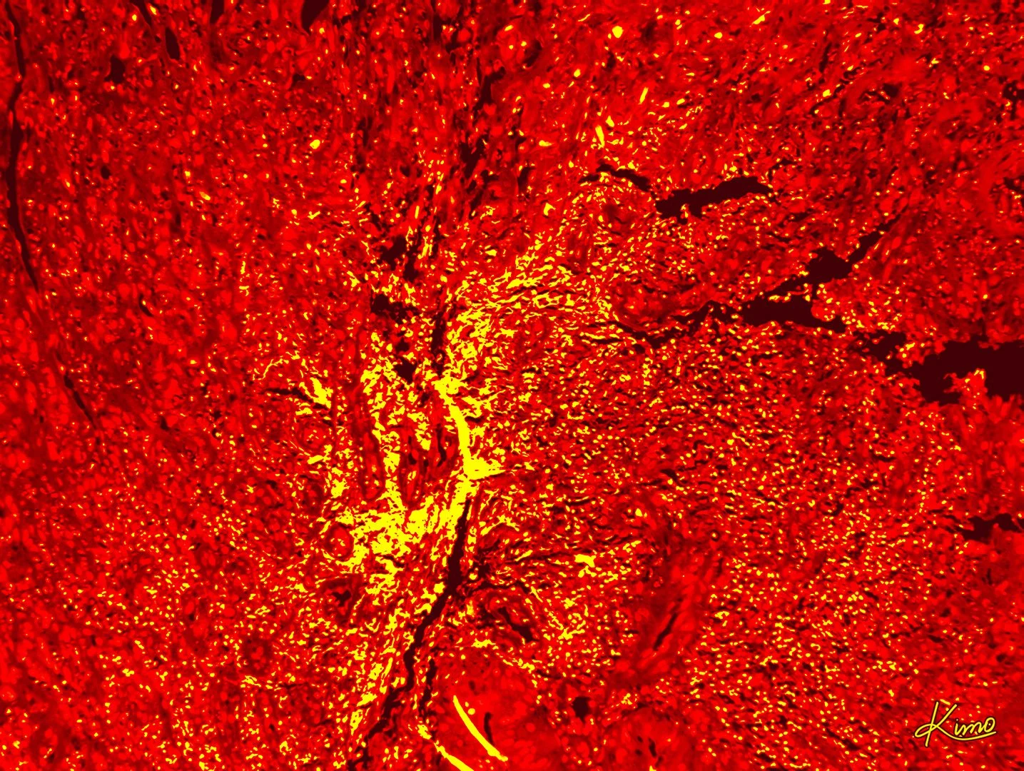 Human cells with digital color manipulation that changes the cells beyond recognition reminiscent of the potential impact of global warming on our planet.